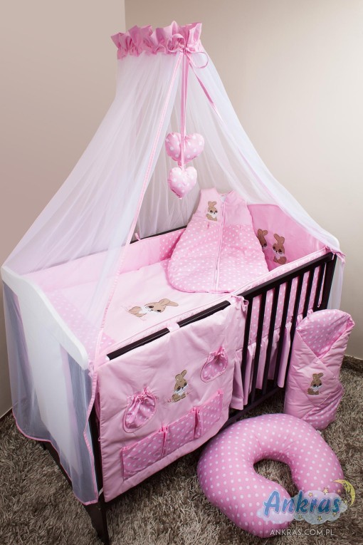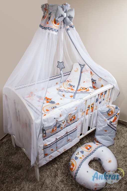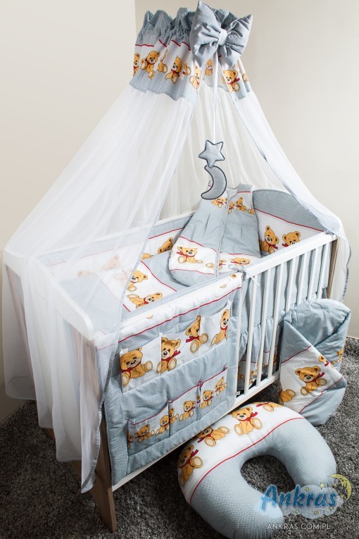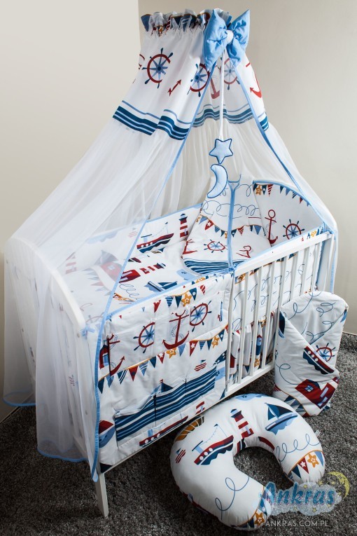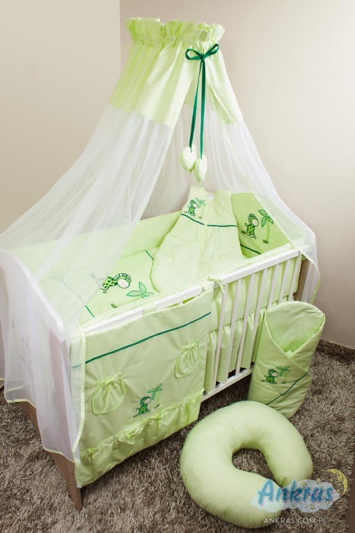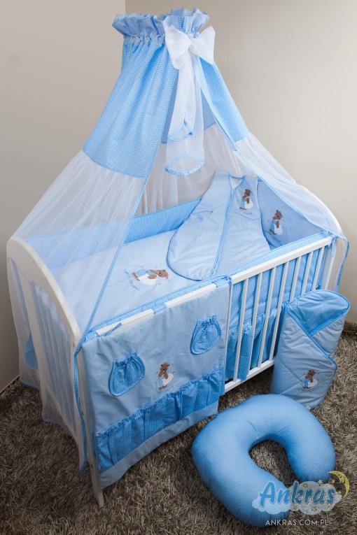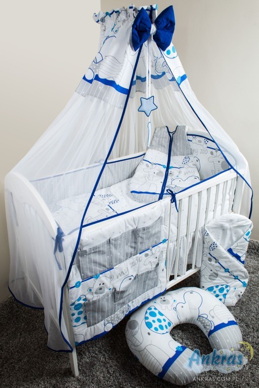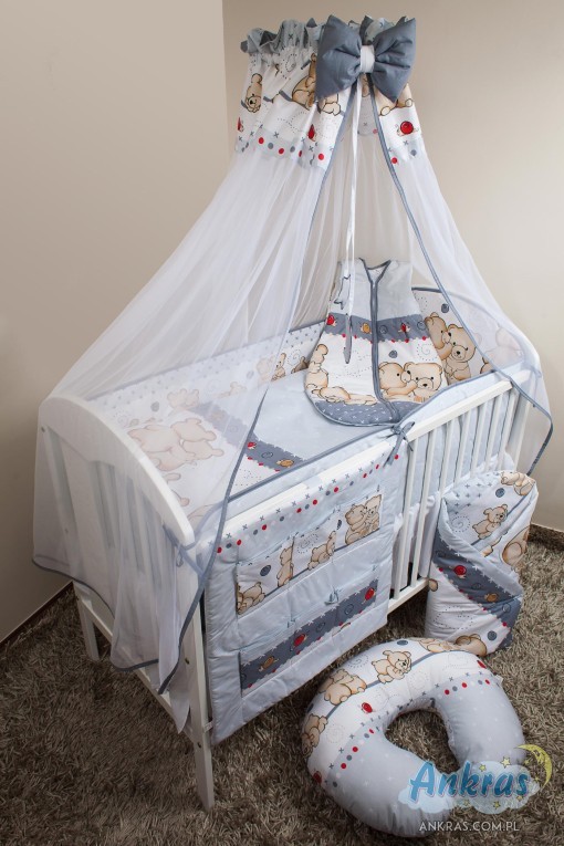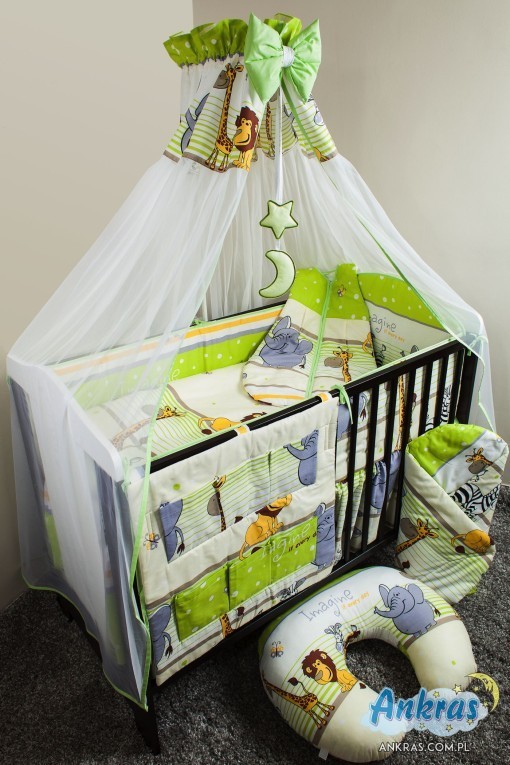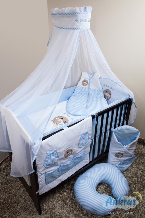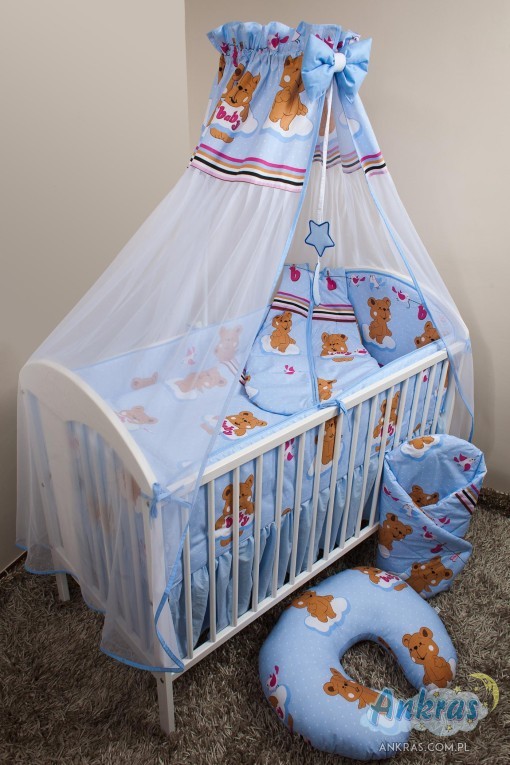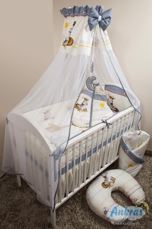 - látkový baldachýn (šírka 200 cm, dĺžka 160 cm) nárazník (dĺžka 360 cm) na priečky postieľky (výška 28 cm) s opierkou hlavy (výška 42 cm) alebo nárazník dlhý 180 cm (výška